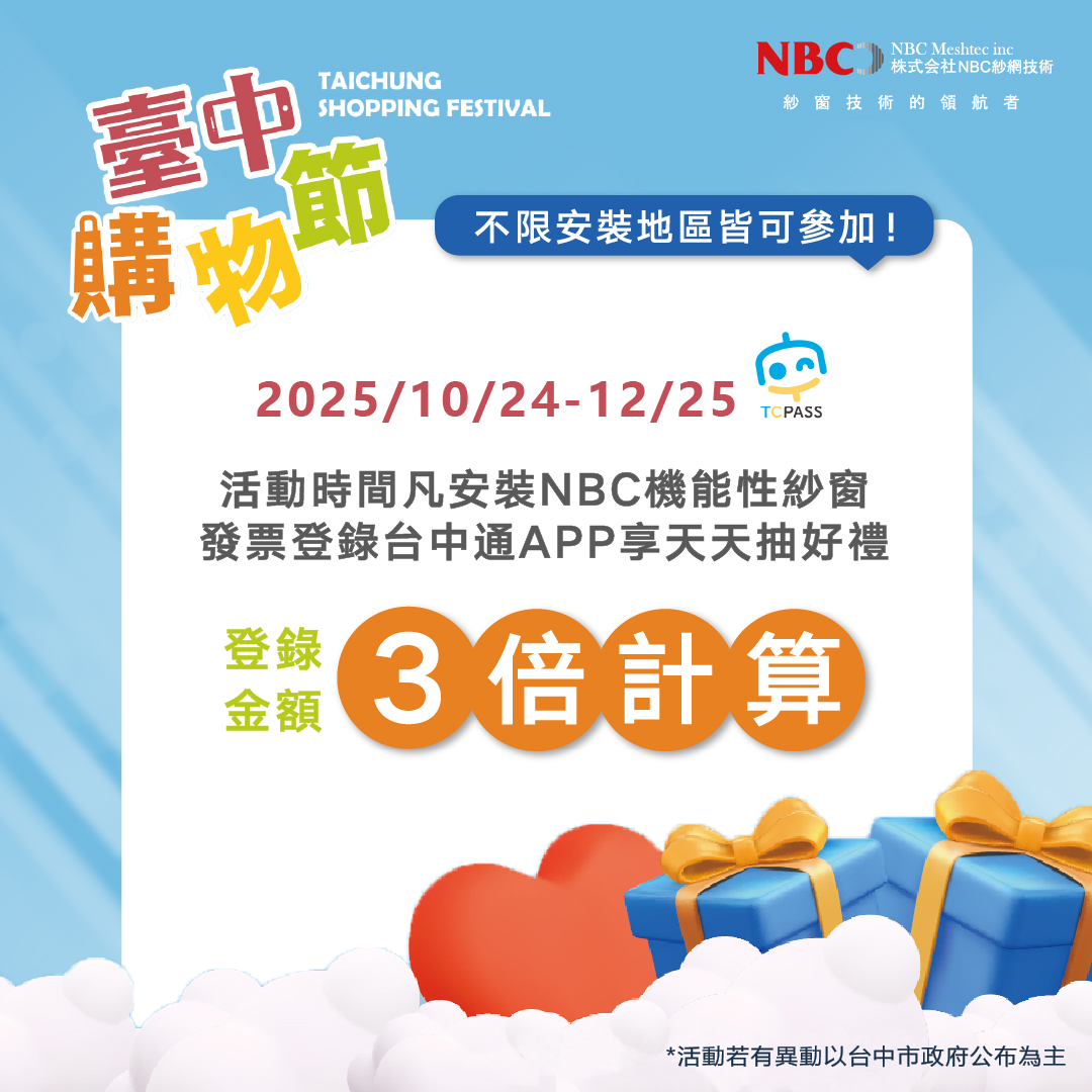 活動辦法:活動時間凡安裝NBC機能性紗窗,發票登錄「台中通」APP,登錄金額享3倍計算!詳情辦法歡迎參閱台中購物節官方網站。